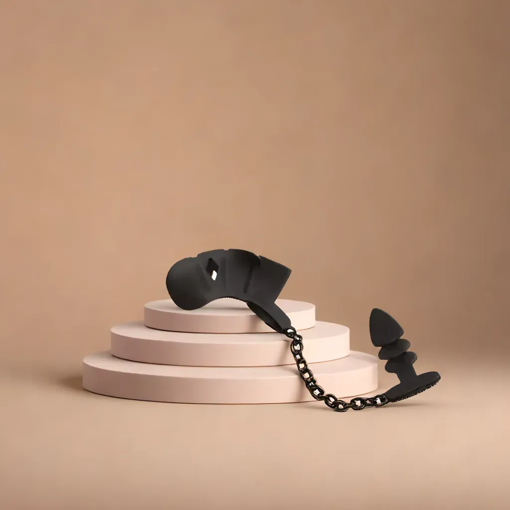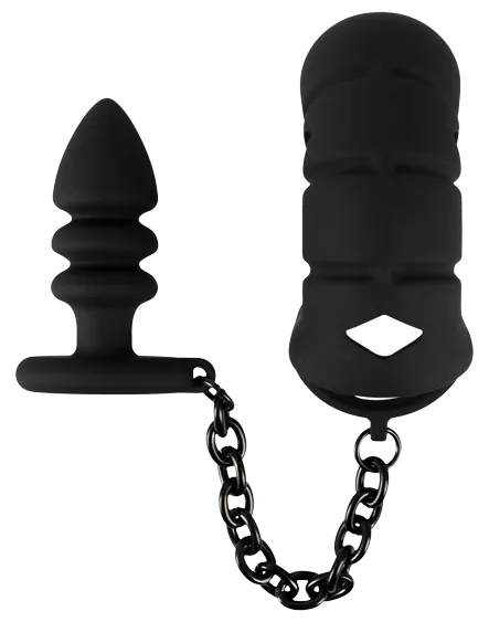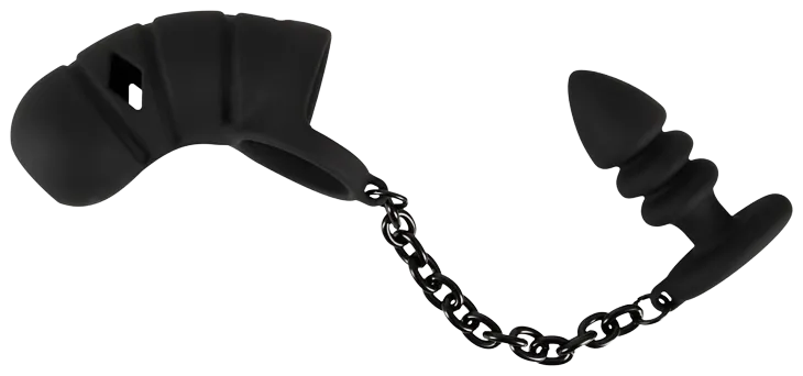 Der anatomisch optimal geformte Silikonkäfig umschließt den Penis liebevoll, während der dehnbare Ring sicher über die Hoden gezogen wird, um einen festen und rutschfesten Halt zu gewährleisten. Der markant geriffelte Analplug, verbunden durch eine robuste Metallkette, bietet zusätzliche Stimulation und ein grandioses Tragegefühl.